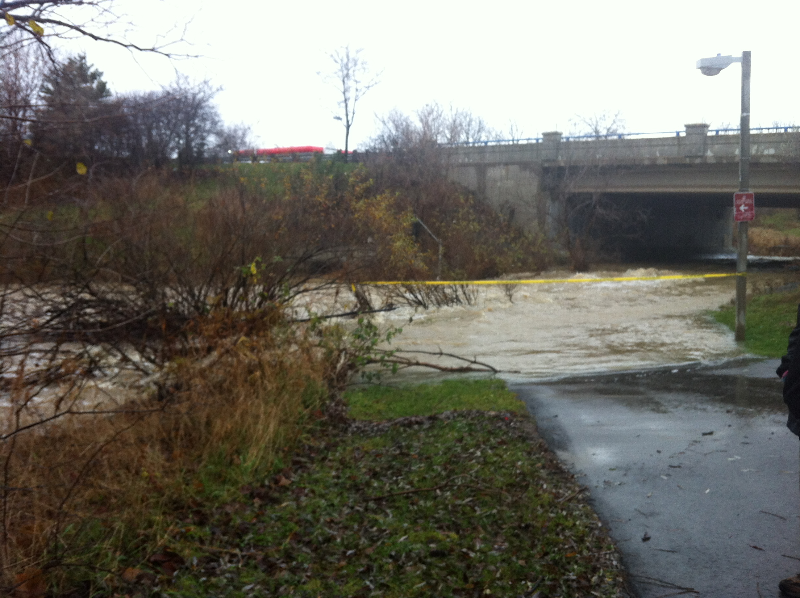 This has only happened to me one other time on my morning walk on the path. This morning the underpass to Williams Parkway was completely flooded. I am not surprised, as it rained hard for much of yesterday (and though you cannot tell from the picture, it was lightly snowing when I snapped this).