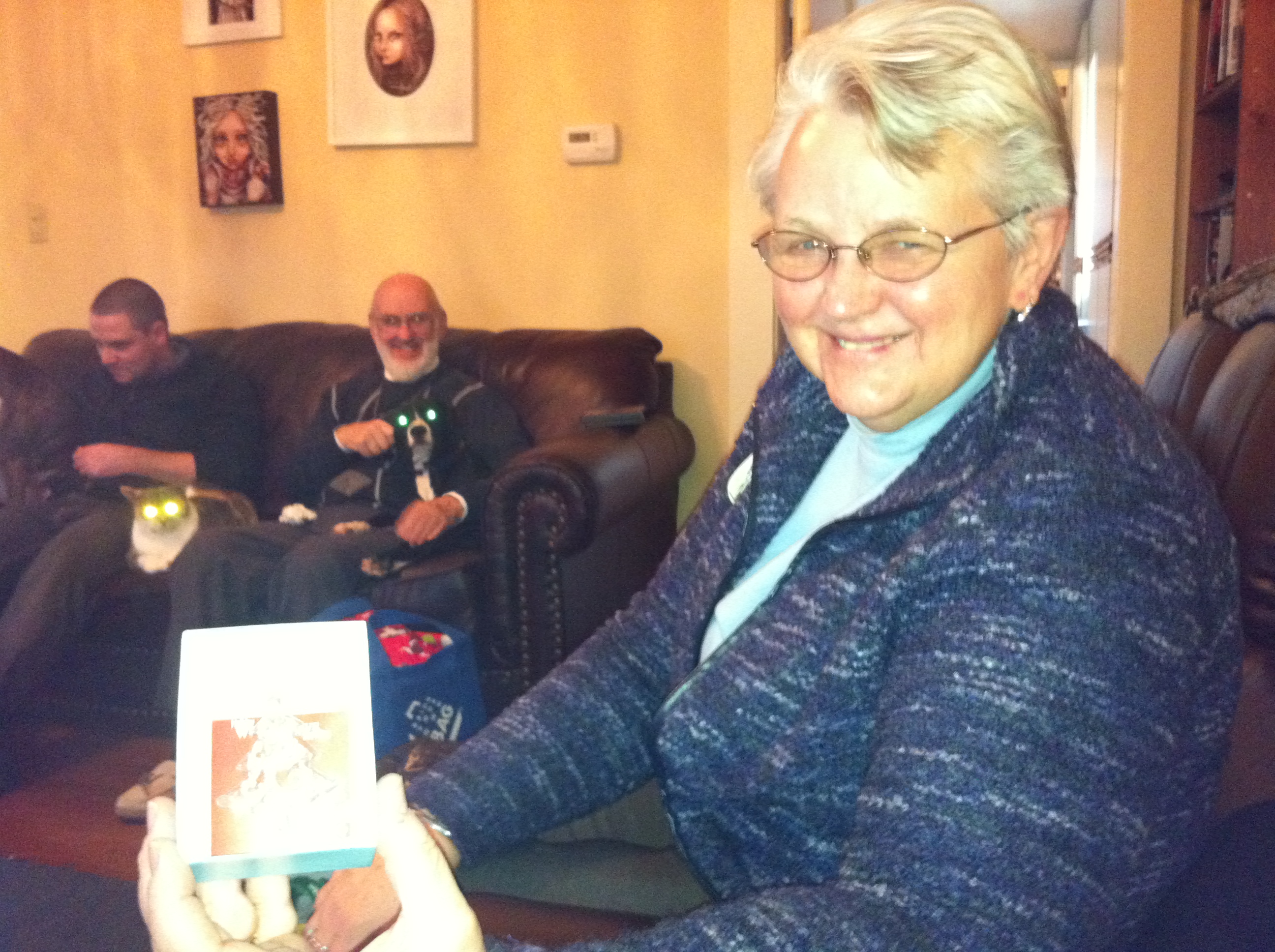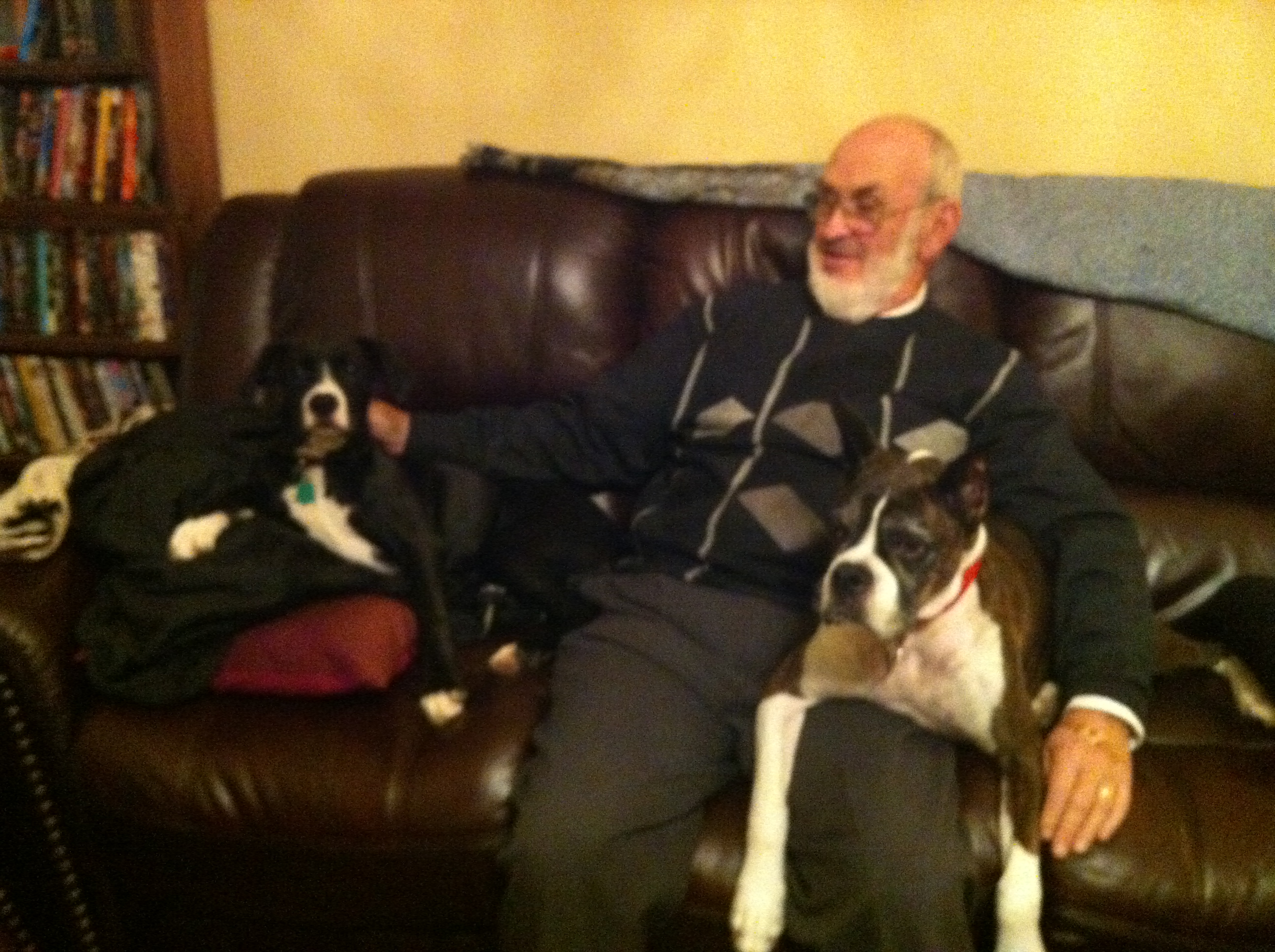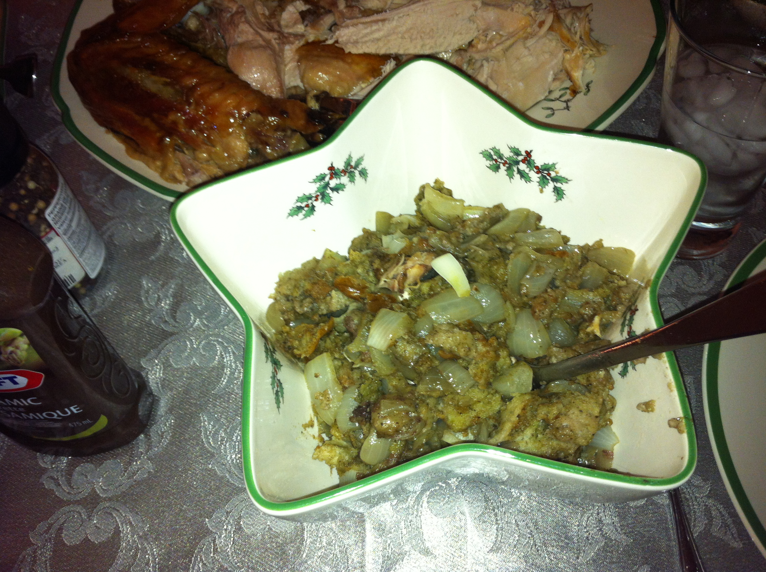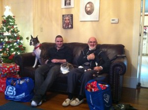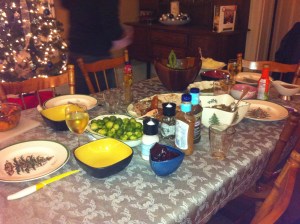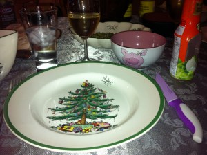 My brother, my father, Keeper, Spot and Koski hanging out just before we began opening our stockings.Mom opening her stocking.Dad hanging out with Koski and Keeper.Keeper and Koski being very well behaved while they wait for us to finish our dinner.The Christmas feast, just before we sat down and devoured it!This is my favorite bowl in the Christmas Spode set that Mom has given to me.I love the juxtaposition of the Christmas Spode with the pig bowl from the dollar store and my funky colored knives.