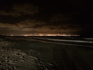 Above: The Mediterranean Sea at night, with the lights of Haifa in the background.