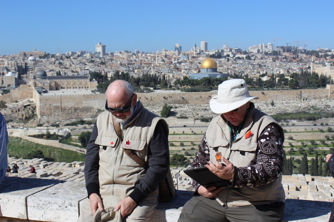 Mom and Dad together as Mom reads the Palm Sunday passage on the Mount of Olives with the temple in the background.