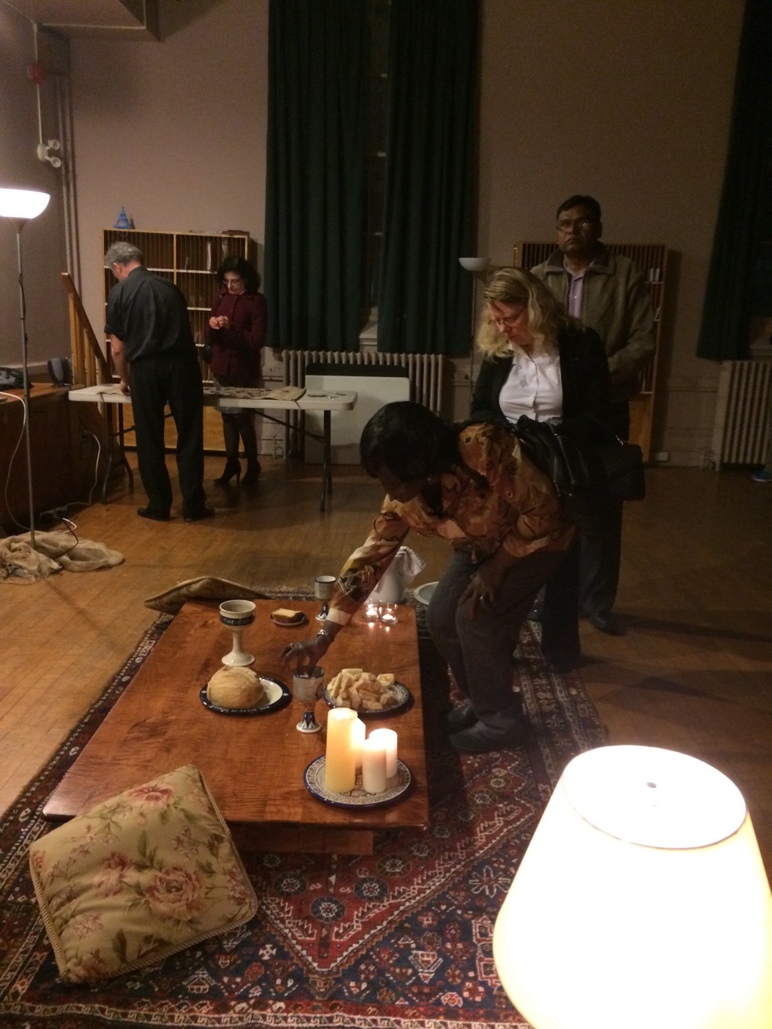 Participants dipping bread in the cup in the Maundy Thursday room.