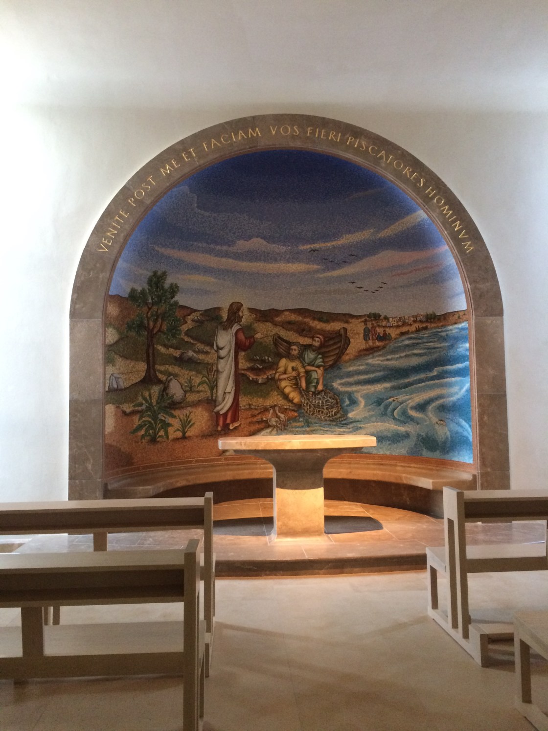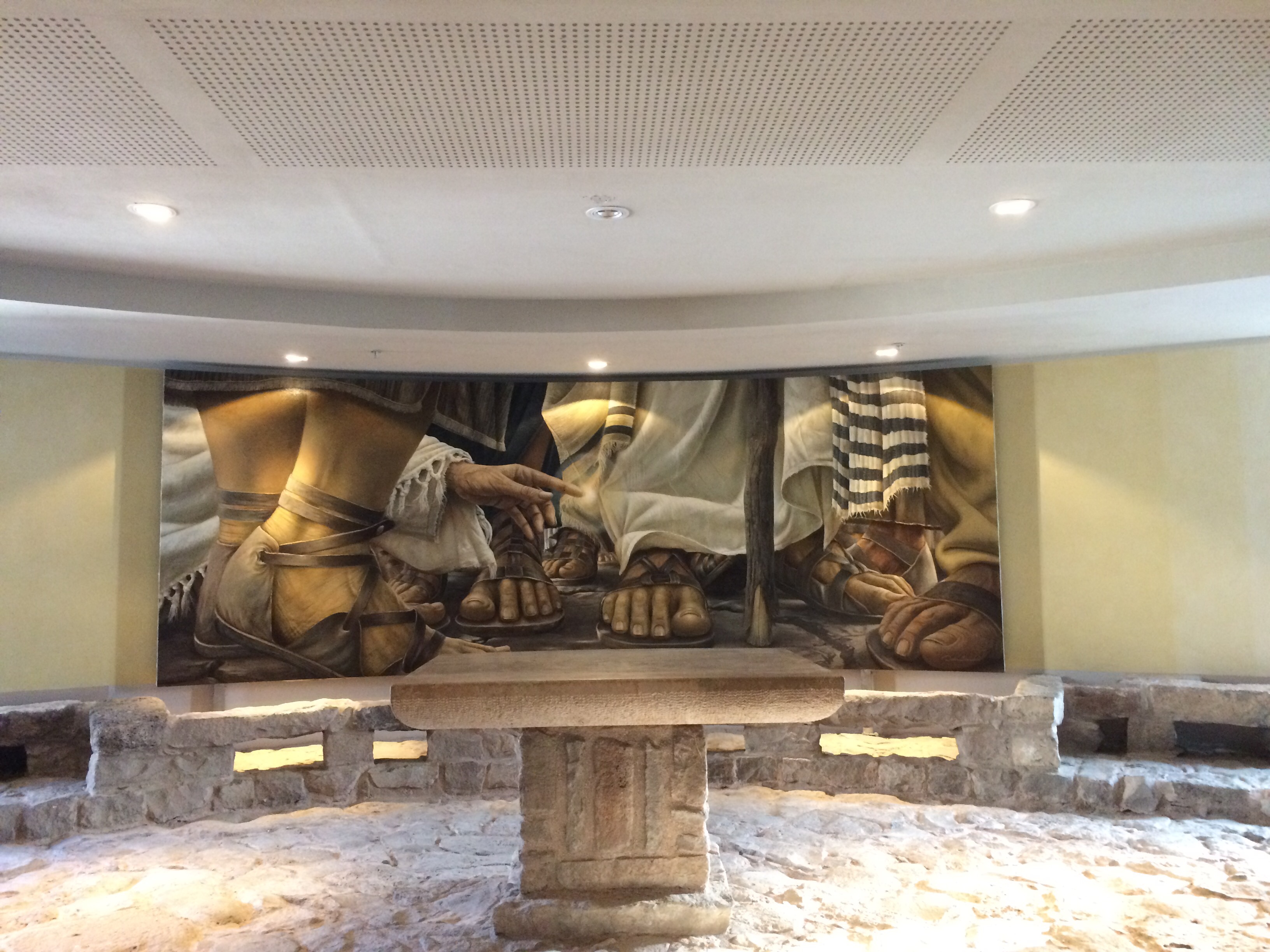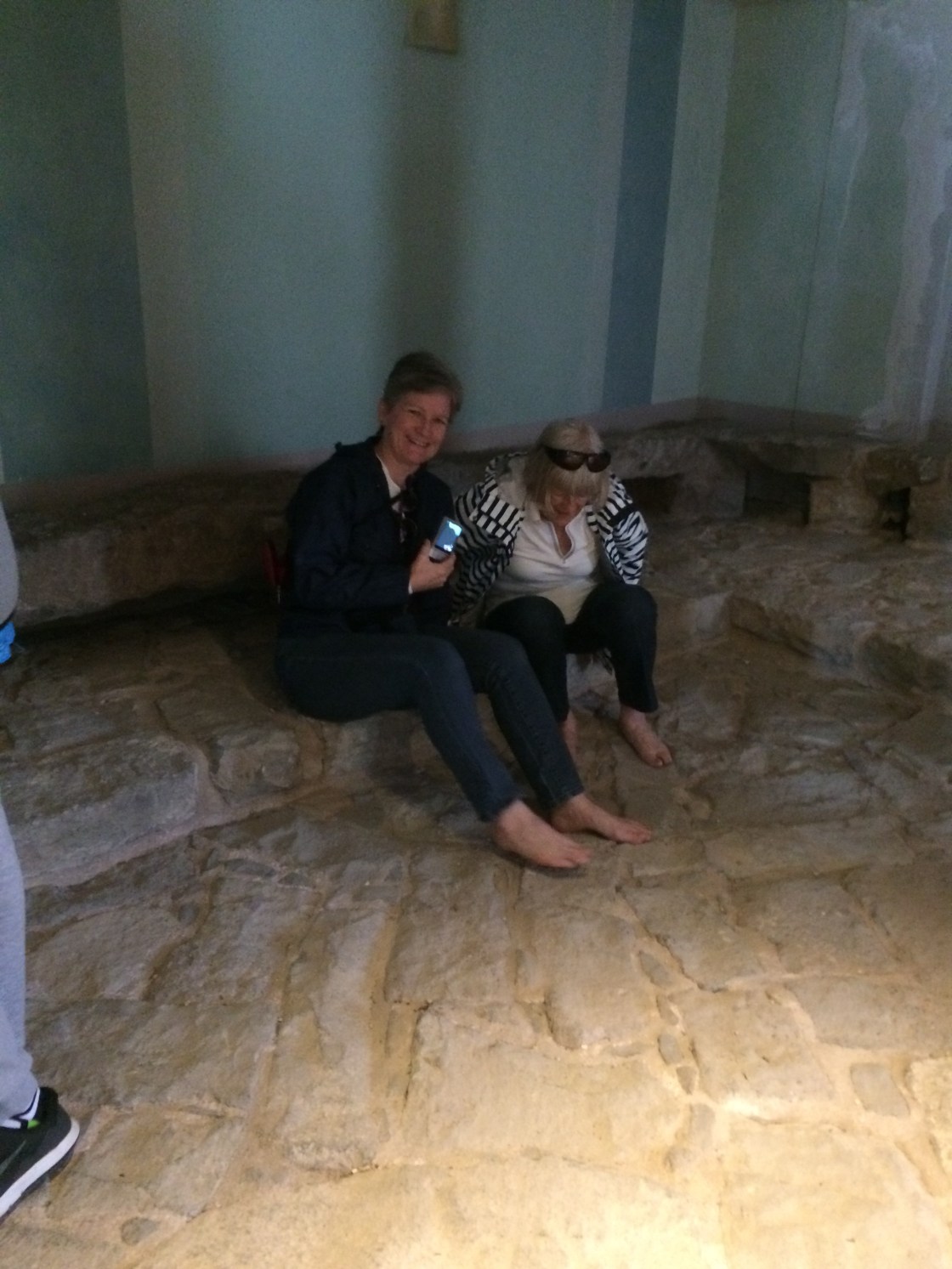 The gorgeous church at Magdala – mosaics in the side-chapels, the boat in the main chapel, the painting of the healing of the woman with the issue of blood in the lower chapel, Nancy and Grace taking off their shoes to walk barefoot where Jesus walked (ancient pier in the lower chapel).