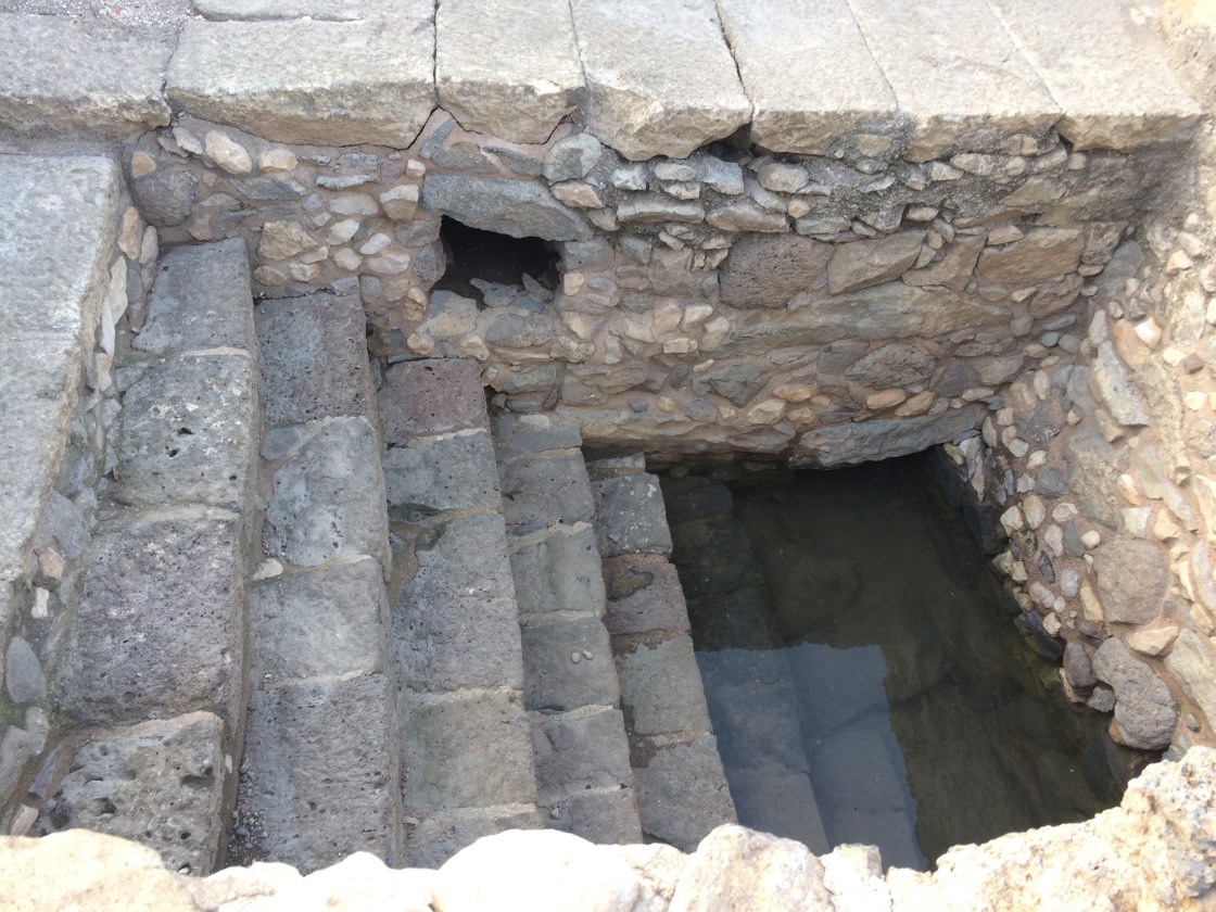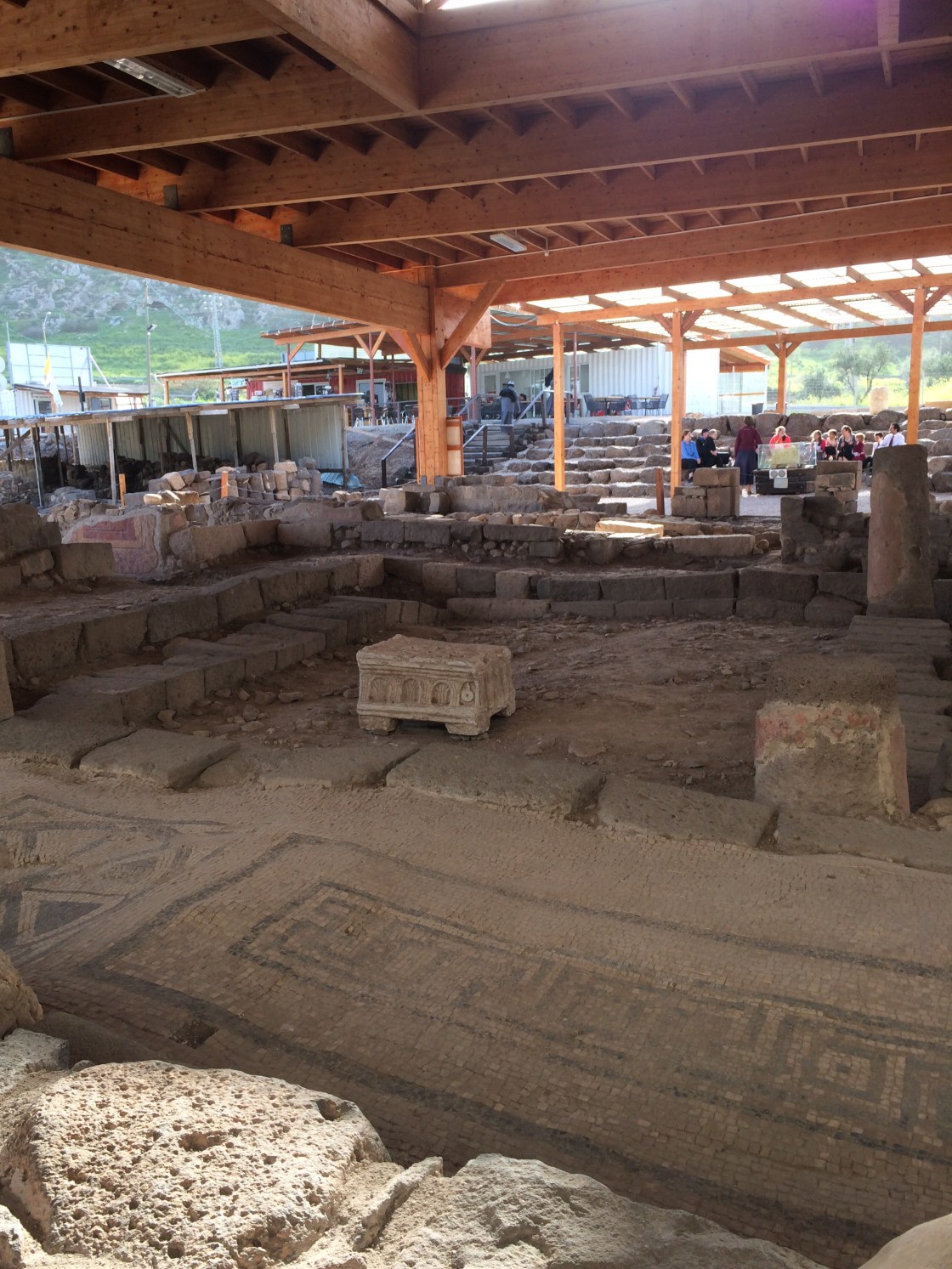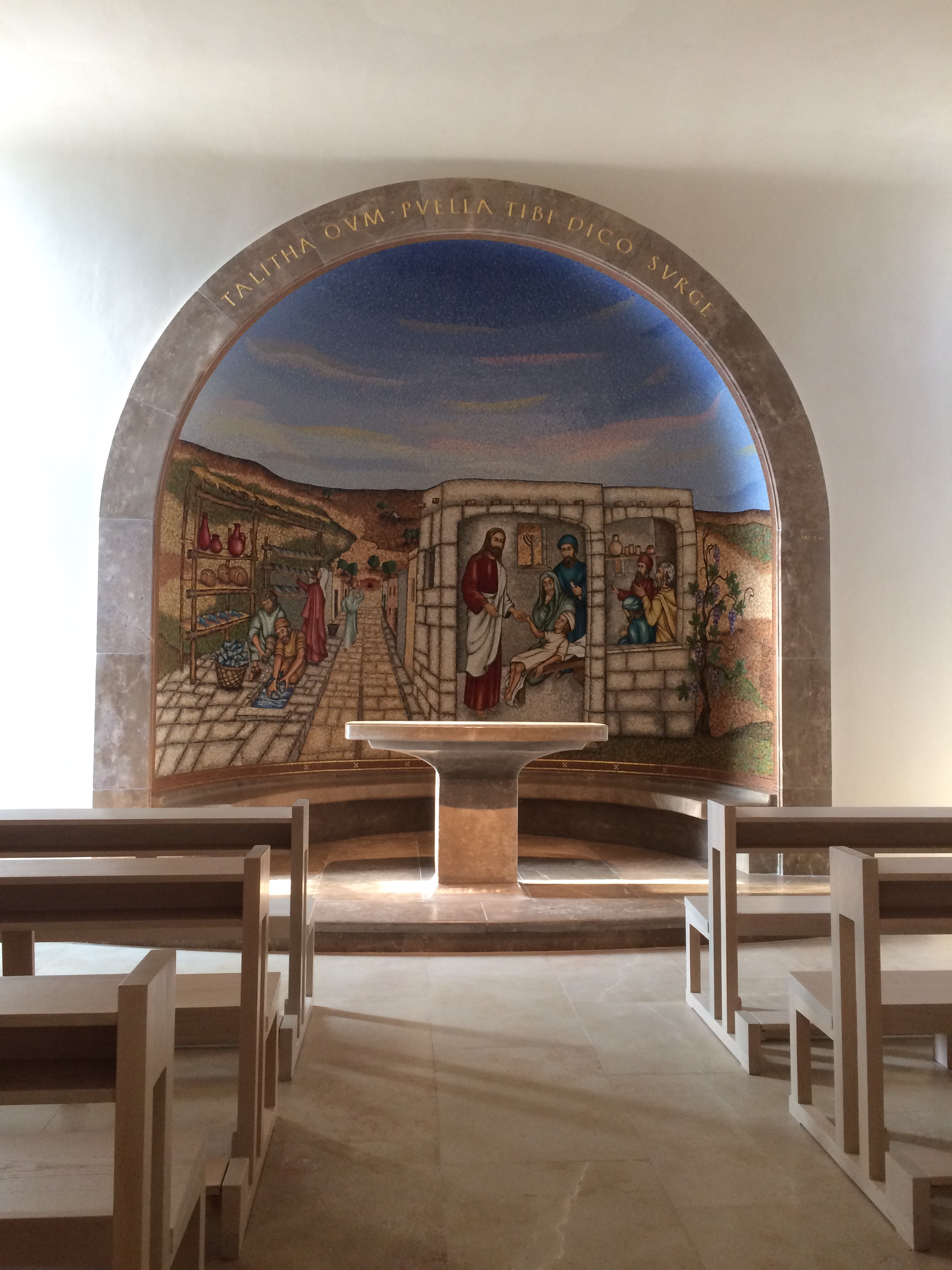 The gorgeous church at Magdala – mosaics in the side-chapels, the boat in the main chapel, the painting of the healing of the woman with the issue of blood in the lower chapel, Nancy and Grace taking off their shoes to walk barefoot where Jesus walked (ancient pier in the lower chapel).
