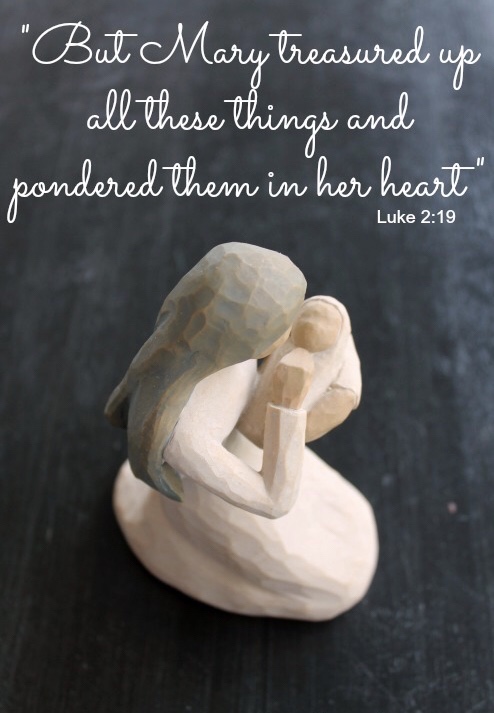 I have this image of Mary cradling her little baby and thinking about all the details of his birth. It’s a peaceful image, but it’s also a mysterious image. I wonder what she thought. I wonder how much she figured out. I wonder what she knew.