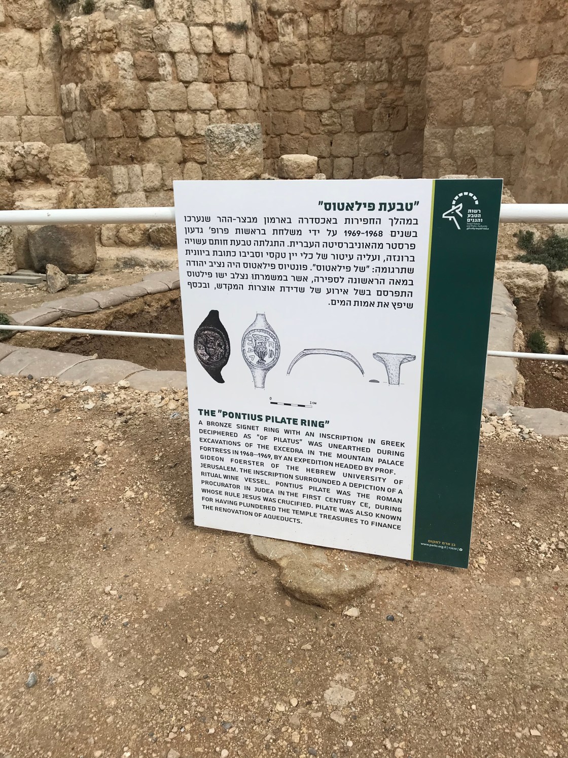 At Herodium, we saw the ruins of Herod’s mausoleum. Our guide, Aharon told us the amazing (true) story of Ehud Netzer – responsible for much of the excavation of Masada and Herodium – who lost his life in an accident at Herodium which saw him falling into the tomb of Herod head first. We also learned that one of the things recovered from the ruins of Herodium was a signet ring that held Pontius Pilate’s name. This is the second piece of archeology that witnesses to Pilate’s existence and his office of influence during Christ’s life (and death).