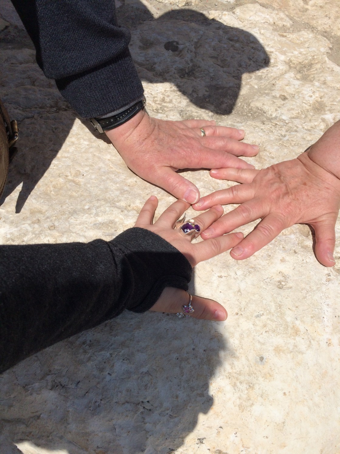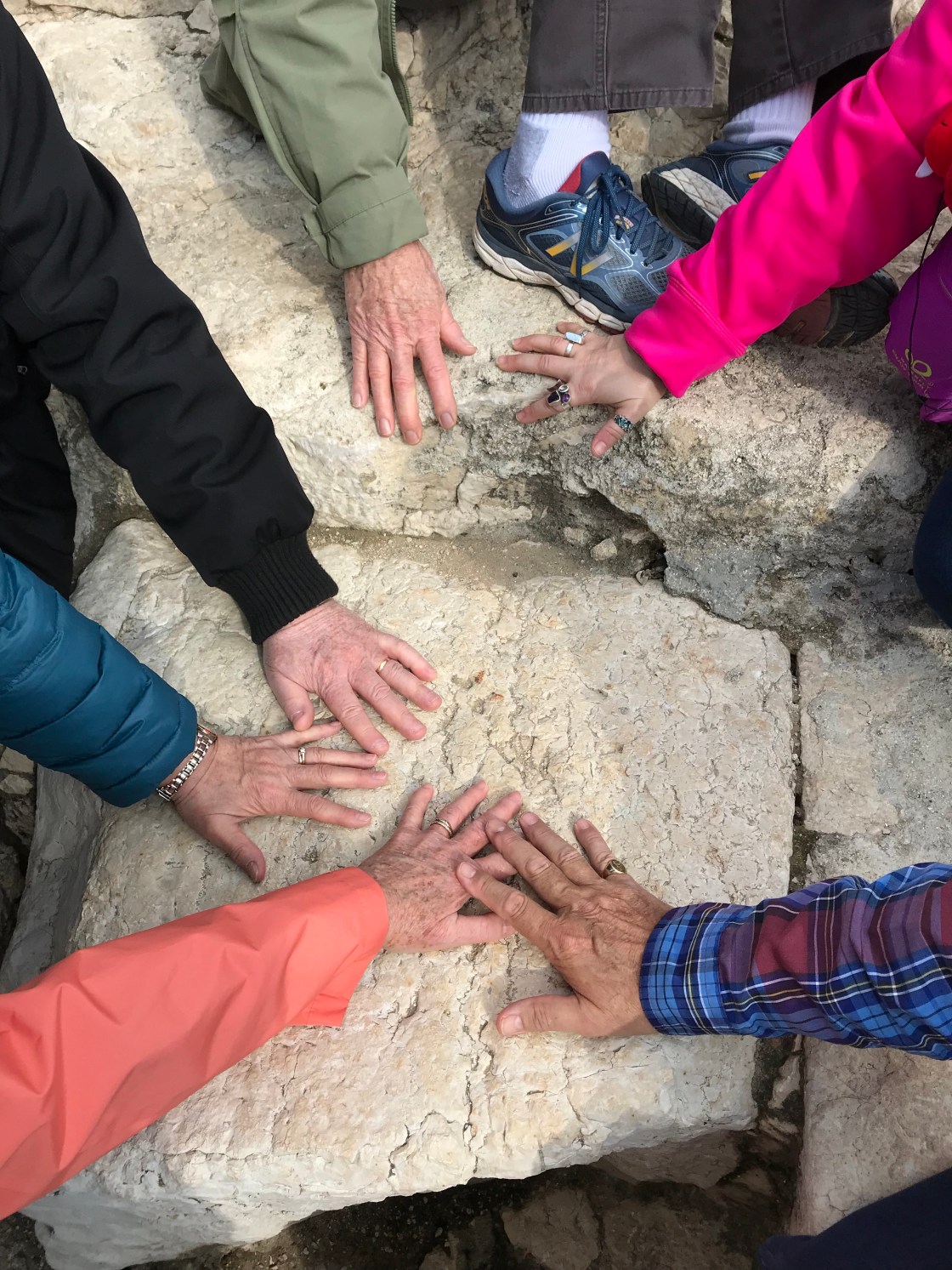 My faithful group of Graceview pilgrims, laying their hands on the Temple Steps with me, this past February: