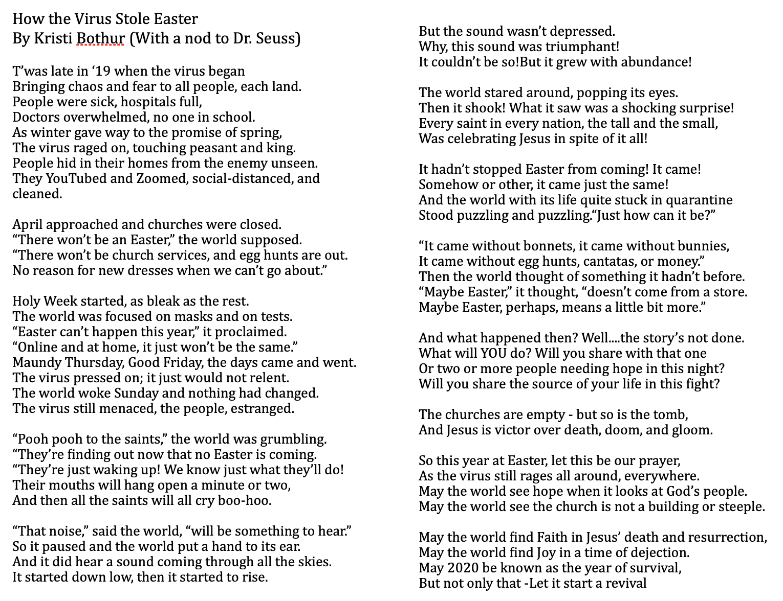 And this lovely bit of a take of on The Grinch that was sent to me by Al and Lynne Bishop. Apparently, I wasn’t the only one thinking about how the virus stole Easter (or at least tried):