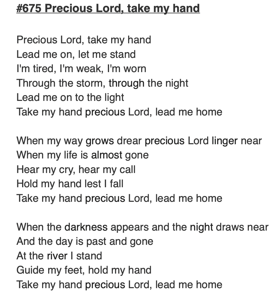 This week, Eric and I have been working together to bring you some hymns that you can sing along with at home. First we have hymn #675, Precious Lord, Take My Hand, the words are provided so you might sing along:
