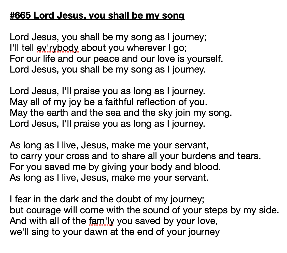 And as a response to the sermon, we have Hymn #665, Lord Jesus, You shall be my song. This is fairly new to us at Graceview, but it’s a beautiful tune and the words have been resonating with me all week. Hear are the lyrics: