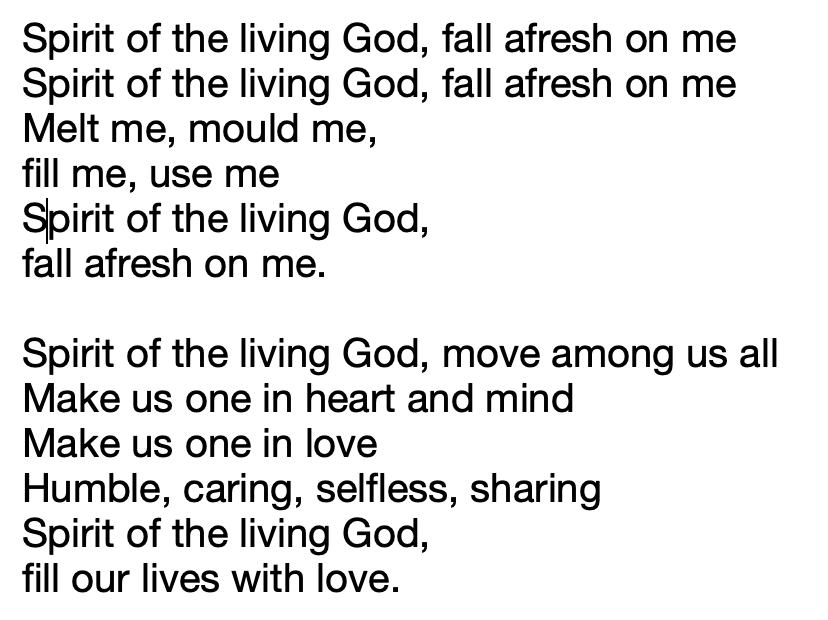 Our first hymn this morning is #400, Spirit of the Living God. You will notice that Eric is playing an introduction to the hymns this week. So wait until he pauses before you start singing along.