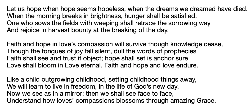 And our final hymn is #792 Let us hope when hope seems hopeless (you may not recognize the words, but I promise you will know the tune! Remember to wait for the intro!):