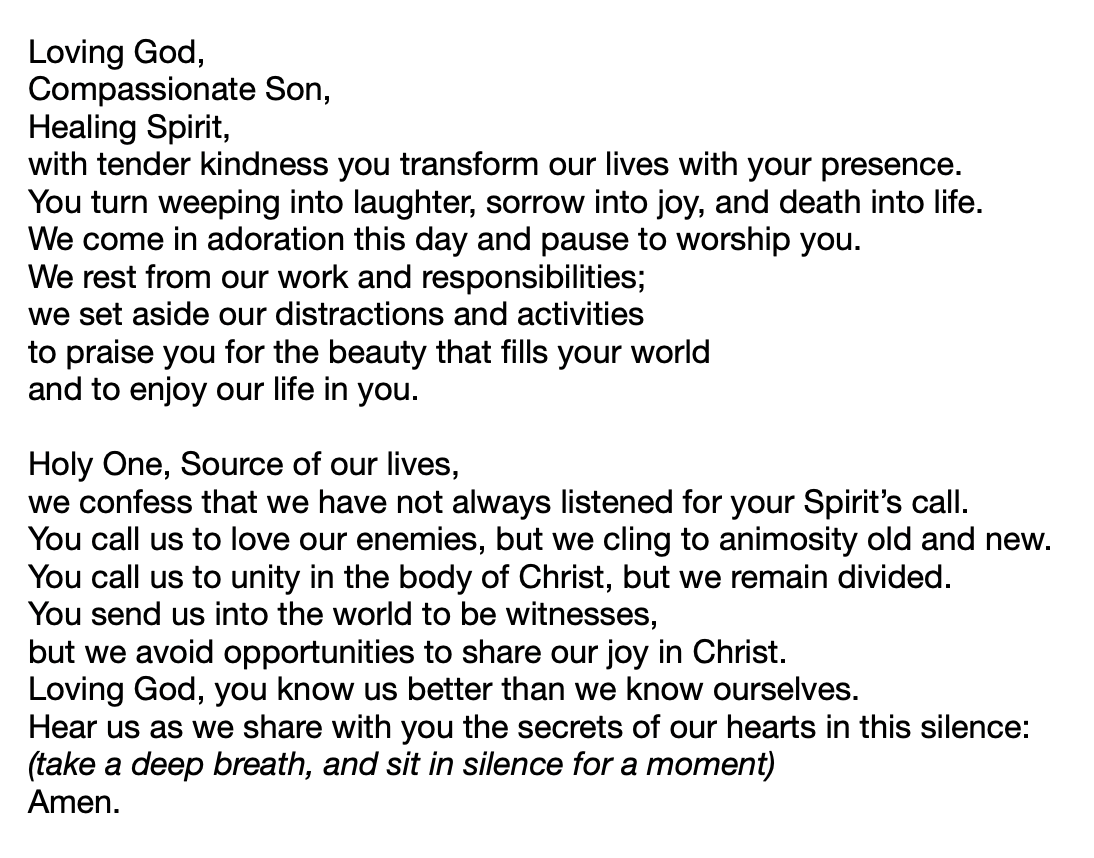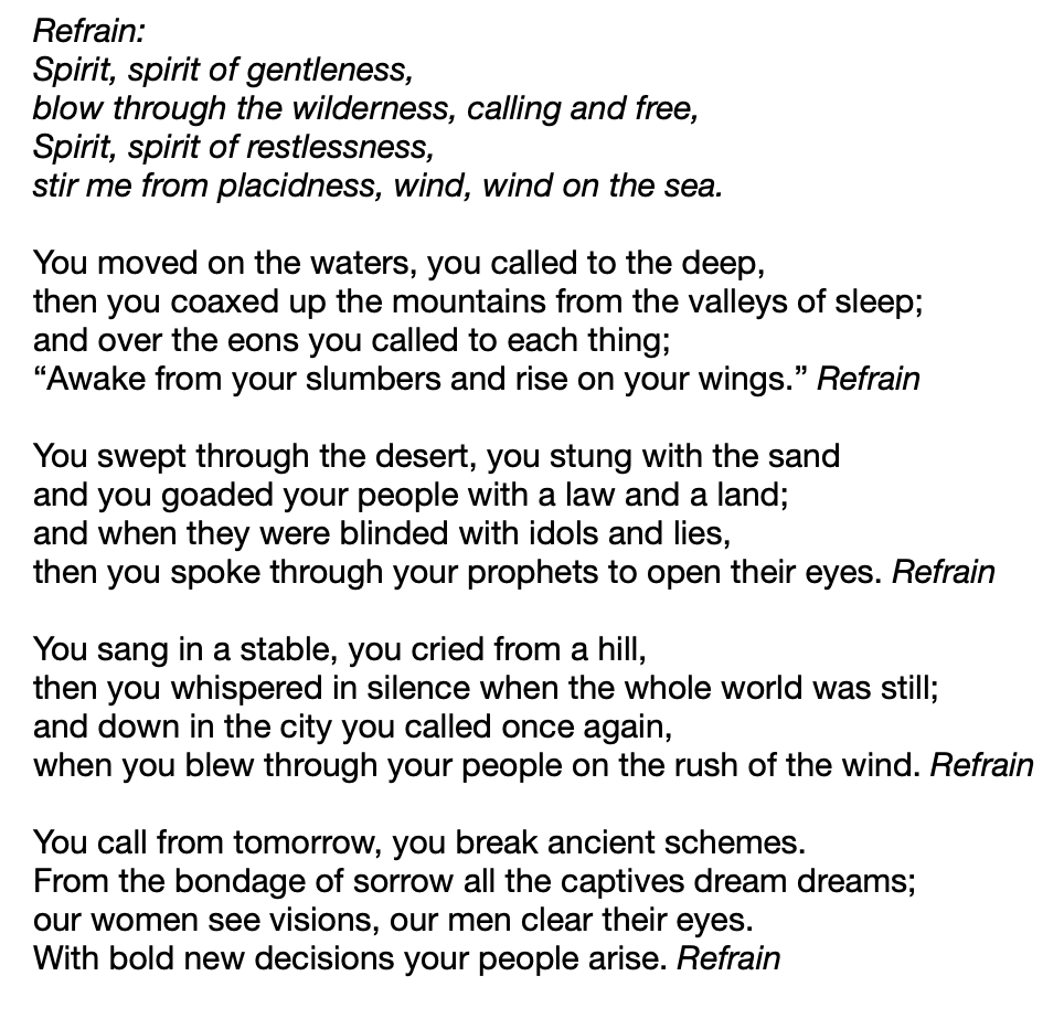 Our first hymn is #399 Spirit, Spirit of Gentleness (remember that Eric is playing an introduction to the hymn, so wait for that before you begin singing along!):