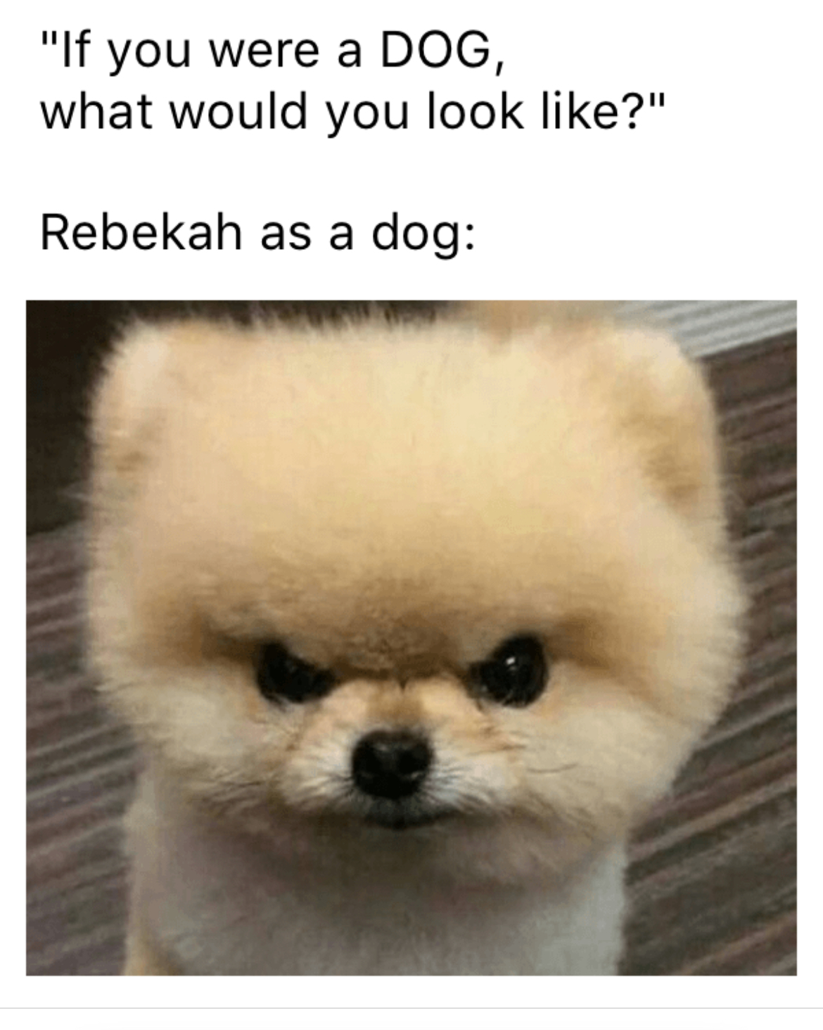 I haven’t stopped giggling about this take on what I’d look like as a dog. This is 100% me in the morning or in the winter. Cute and fuzzy and annoyed! HAHAHA!: