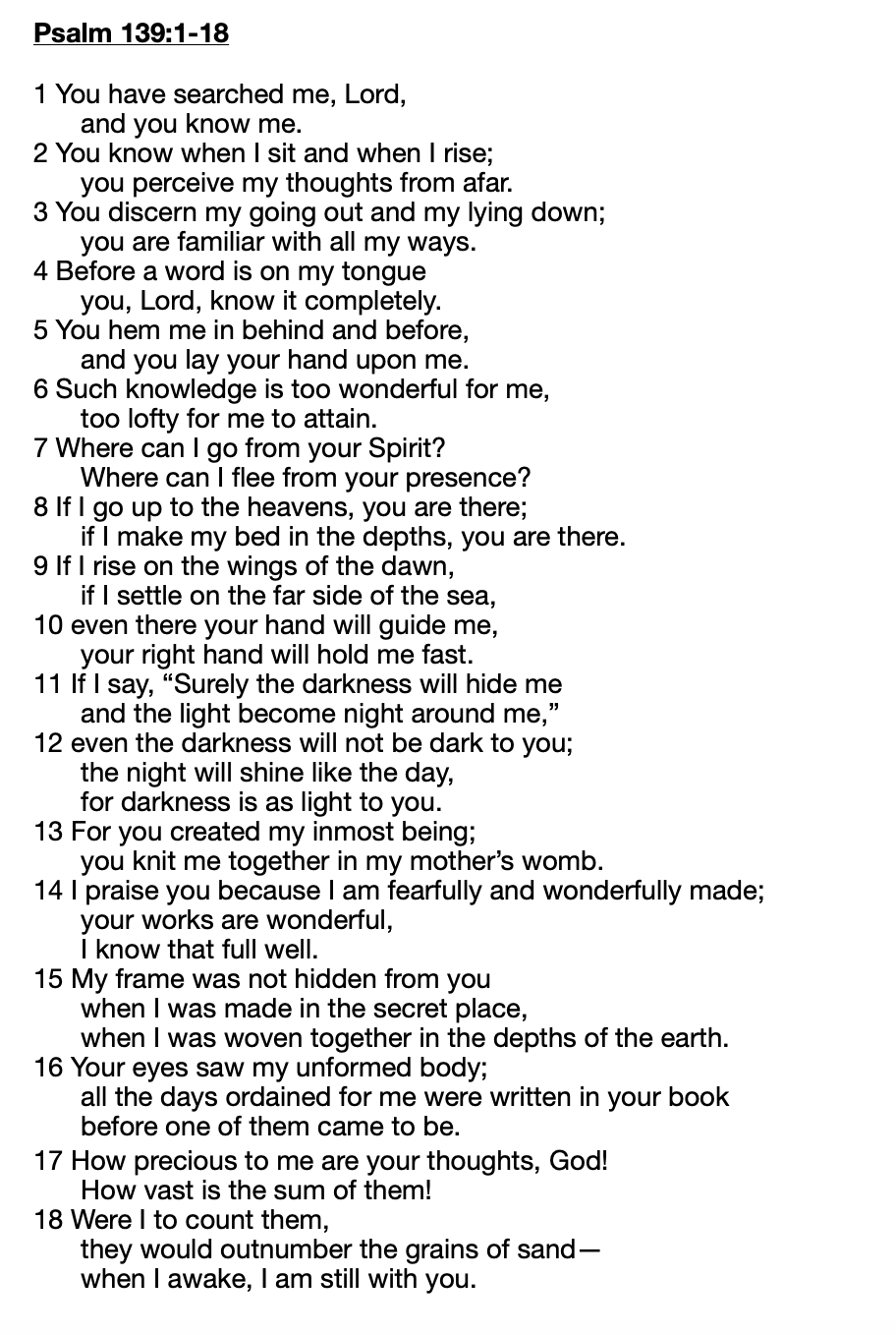 Our Scripture Reading this morning is Psalm 139:1-18: