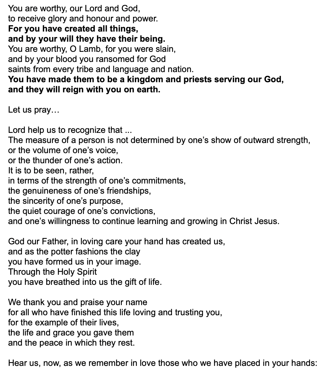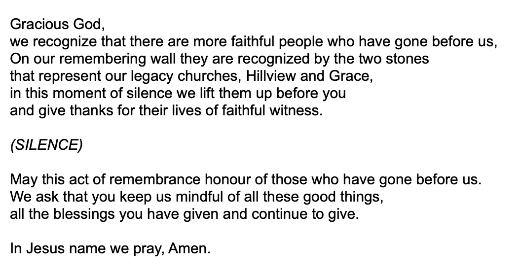 Sunday was All Saints Day, and during our service at Graceview, we read the names and honoured the memories of those who have been lost from our congregation over the past 20 years (since Grace and Hillview amalgamated to become Graceview). We wanted to share that part of the service with those who were not able to join us in-person. So that’s what this post is all about!