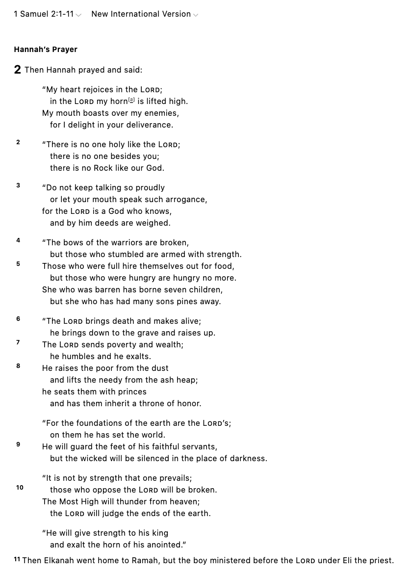 Our Scripture passage is Hannah’s prayer of praise, from 1 Samuel 2:1-11: