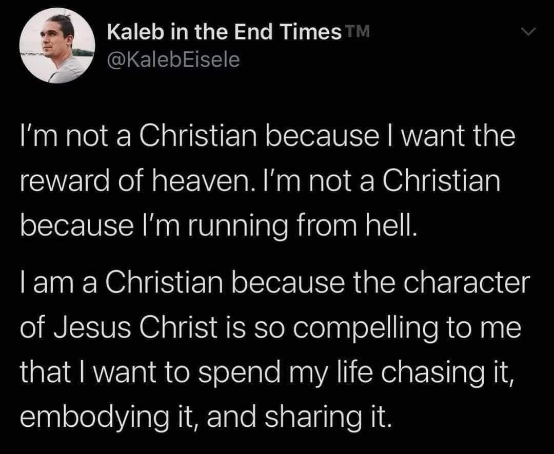 It jarred me out of my doom scrolling and made me ask myself – why am I following Jesus? And the original poster’s reasons align pretty well with my own.